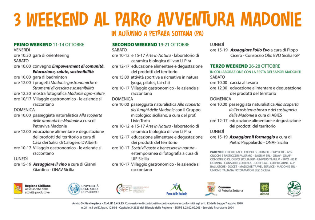 Essere riconosciuti come regione gastronomica d’Europa è un meritato riscontro per le Madonie che vantano eccellenze e specificità nel comparto agroalimentare e possono raccontare una biodiversità naturalistica e una identità culturale di grande valore per il turismo. L’evento è organizzato in collaborazione con il Parco Avventura delle Madonie e una ampia rete partenariale, pubblica e privata.
